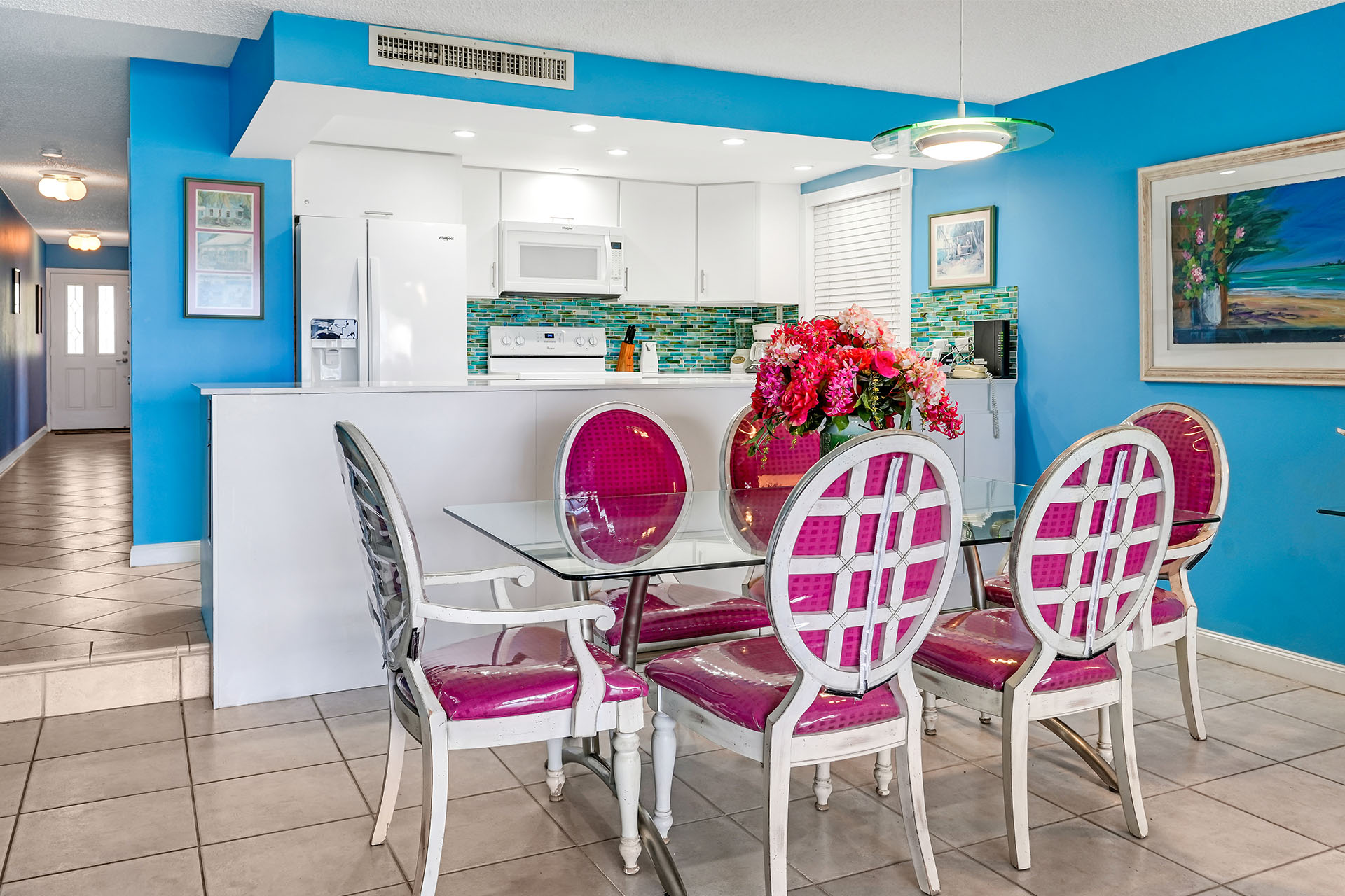 The kitchen is fully equipped with a full-sized fridge, dishwasher, microwave, plates, glasses, and cutlery.
